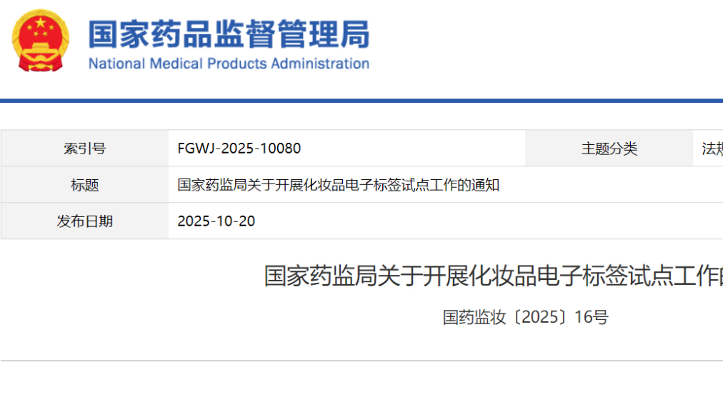 國家藥監(jiān)局關(guān)于開展化妝品電子標簽試點工作的通知 國藥監(jiān)妝〔2025〕16號
