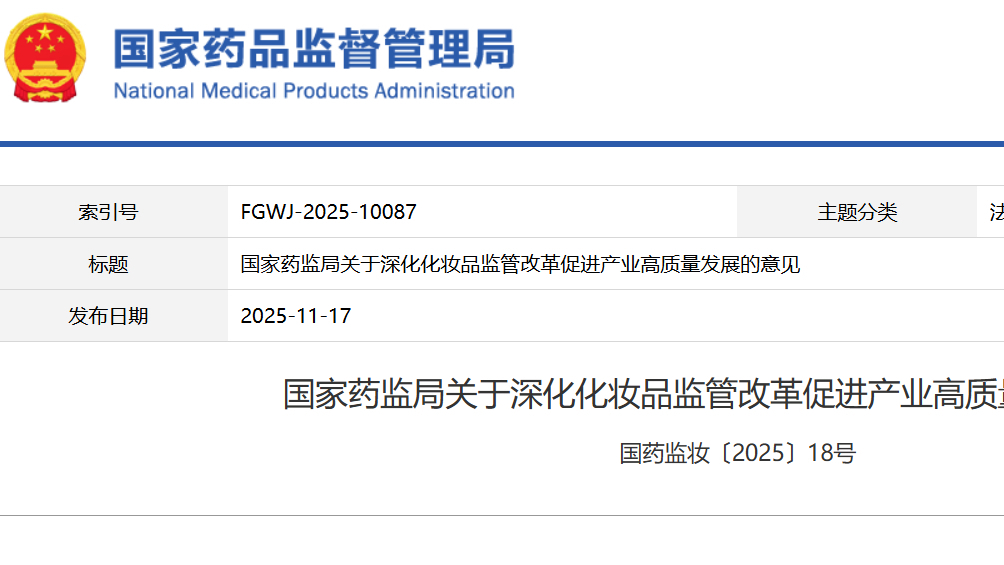 國家藥監(jiān)局關(guān)于深化化妝品監(jiān)管改革促進產(chǎn)業(yè)高質(zhì)量發(fā)展的意見 國藥監(jiān)妝〔2025〕18號