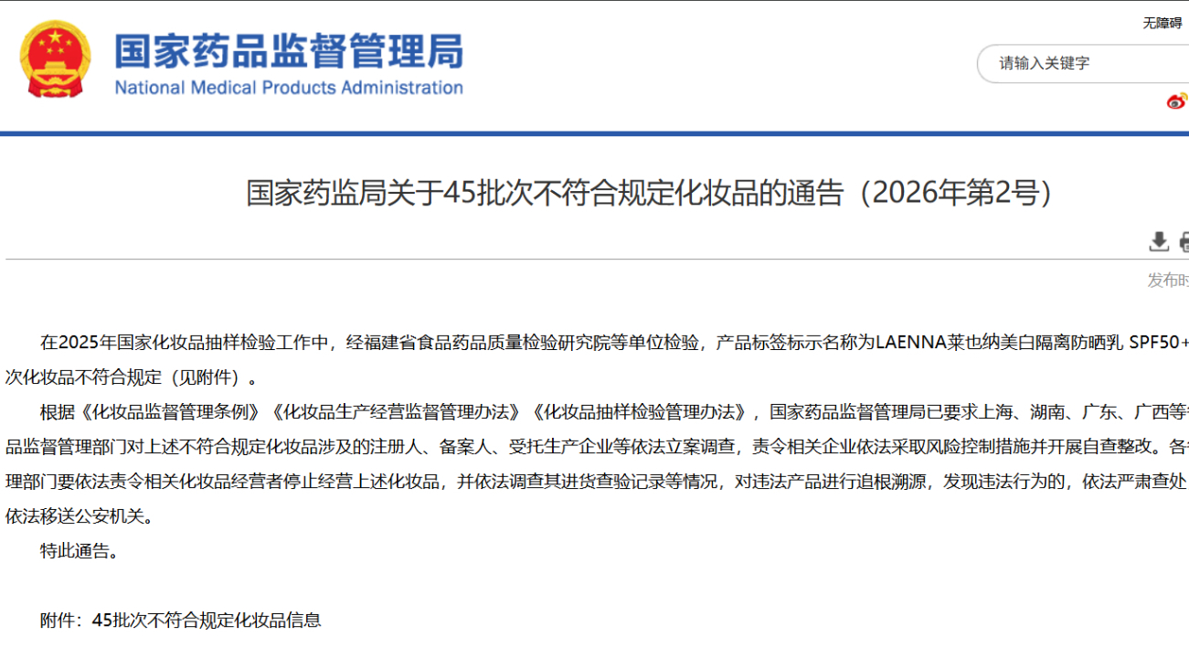 國家藥監(jiān)局關(guān)于45批次不符合規(guī)定化妝品的通告(2026年第2號)