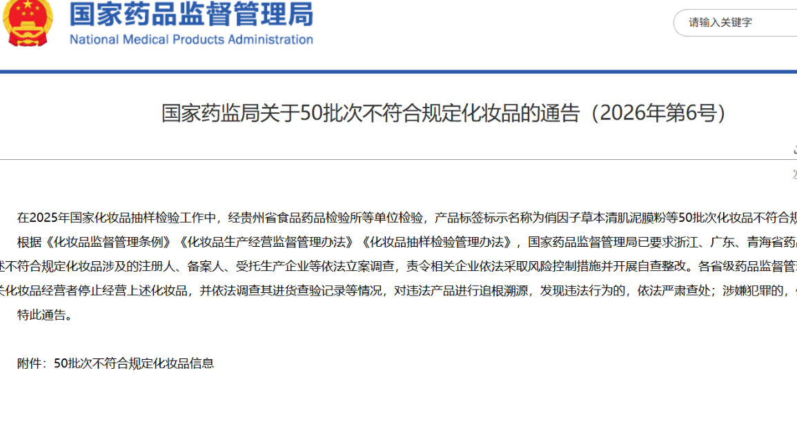 國家藥監(jiān)局關(guān)于50批次不符合規(guī)定化妝品的通告(2026年第6號)