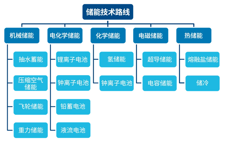 储能的技术路线众多,根据能量存储形式的不同,可以分为机械储能、电化学储能、化学储能、电磁储能和热储能等。