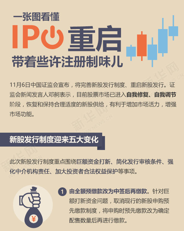 ????新華網(wǎng)北京11月6日電(記者 屈紹輝)6日中國證監(jiān)會宣布,將完善新股發(fā)行制度重啟新股發(fā)行。證監(jiān)會相關(guān)負(fù)責(zé)人表示,此次改革重點(diǎn)圍繞解決巨額資金打新、簡化發(fā)行審核條件、強(qiáng)化中介機(jī)構(gòu)責(zé)任、加大投資者合法權(quán)益保護(hù)等事項(xiàng),這是新股發(fā)行體制改革的進(jìn)一步深化,朝著股票注冊制改革的方向又邁出了堅(jiān)實(shí)的一步。