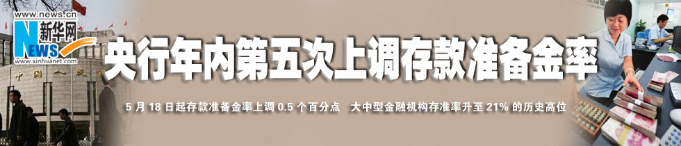 央行12日晚間宣布,從5月18日起,上調(diào)存款準備金率0.5個百分點。這是央行年內(nèi)第五次上調(diào)存款準備金率,也是去年以來第十一次上調(diào)。本次上調(diào)大約可鎖定商業(yè)銀行3700億元資金。 [詳細]