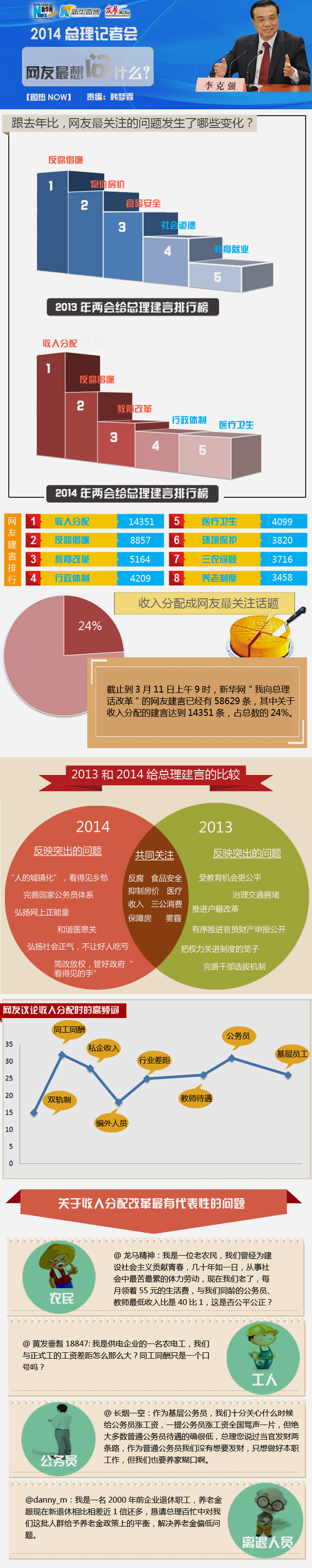 3月13日上午,國(guó)務(wù)院總理李克強(qiáng)將與中外記者見(jiàn)面,回答大家的問(wèn)題。這是李克強(qiáng)總理第二次總理記者會(huì),今年新華網(wǎng)推出了大型互動(dòng)專題"我和總理話改革",收到了數(shù)萬(wàn)條網(wǎng)友建言,在這些建言中,哪些問(wèn)題是網(wǎng)友最關(guān)心的,如果是網(wǎng)友在記者會(huì)上提問(wèn),他們最想問(wèn)什么?