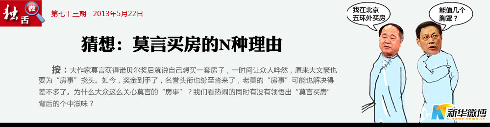 猜想四:生活方便才能工作方便 獲得諾獎了,拿到獎金了;當上主任了,有了編制了;演講變多了,交際頻繁了……為了以后工作便利,支持莫言老師在宇宙中心購房,希望莫言老師再創(chuàng)佳績。