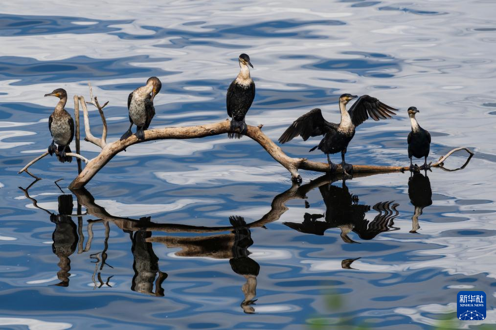 3月2日,在肯尼亚纳库鲁湖国家公园,一群鸬鹚在水面上停歇。