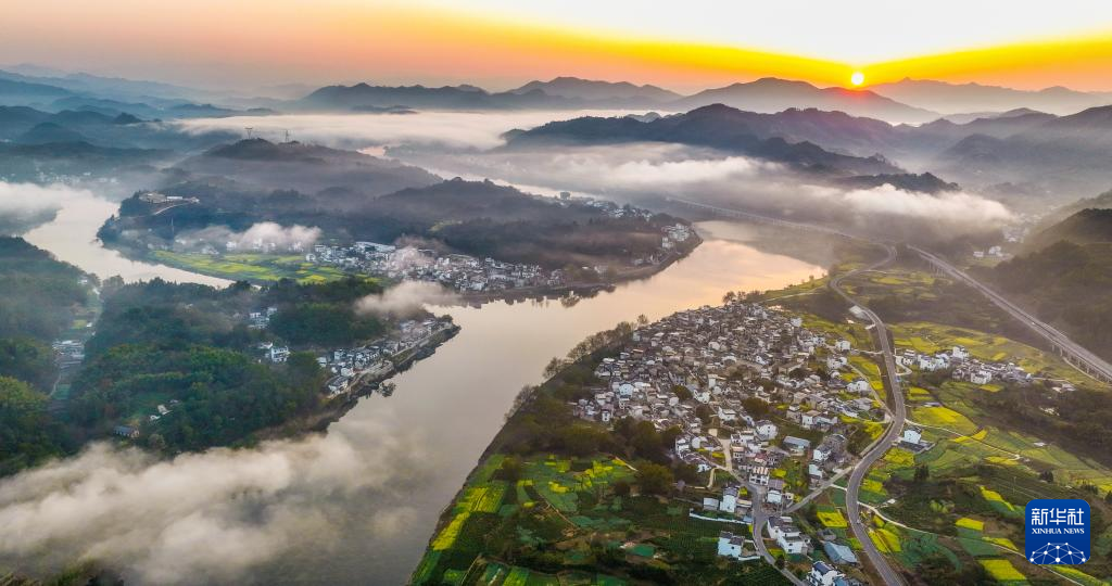 3月15日在安徽省黄山市歙县雄村拍摄的新安江沿岸风景(无人机照片)。