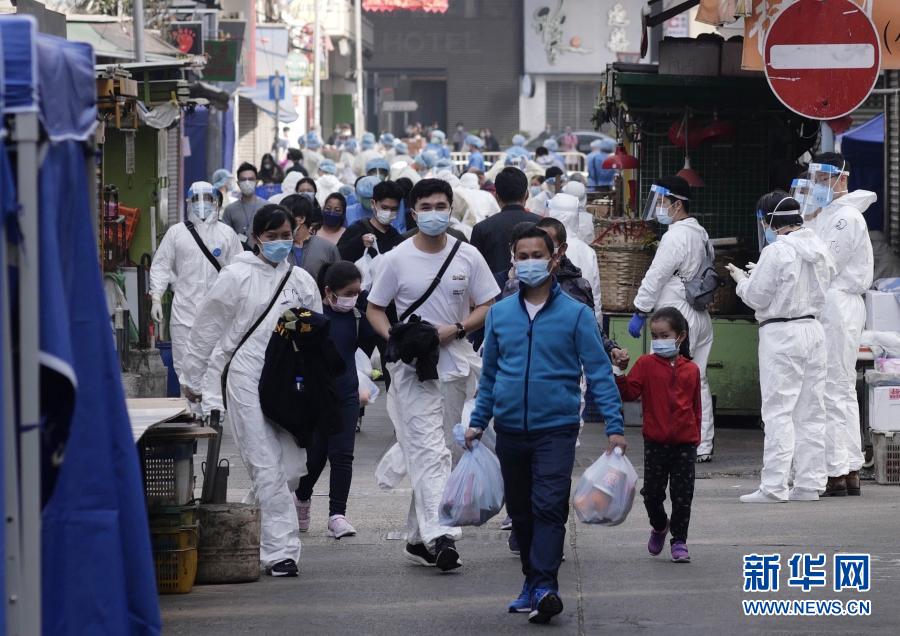 1月23日,在香港佐敦指明“受限區(qū)域”,該區(qū)域居民領(lǐng)取物資回到樓宇中。新華社記者 王申 攝