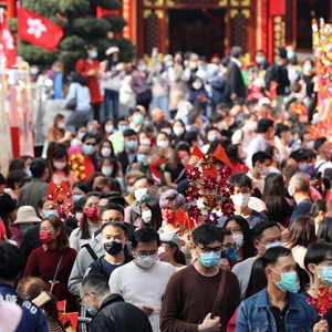 初一下午,大批市民在黃大仙祠前的廣場上排成長龍,有序往前“流動”。入口處豎立著一塊電子顯示屏,上有祠內人數(shù)實況,提醒門口防疫人員何時放行。