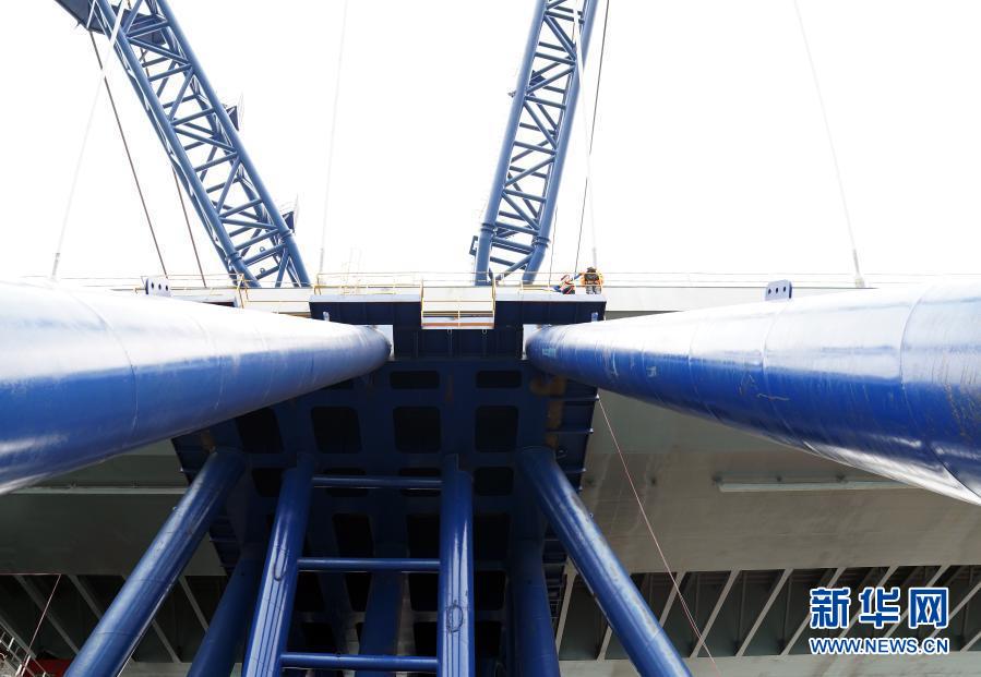 “冒出來”的并不是一座完整的大橋,而是一段跨徑長達200米的雙拱鋼橋,在海面中央兀然矗立?!斑@是我們大橋工程最核心的主橋部分,技術(shù)難度最大,對整個項目有里程碑的意義?!背薪▎挝恢袊窐蚬こ逃邢薰径?、項目總指揮闞軍說。