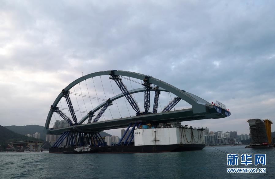 2月26日,將軍澳跨灣大橋主橋順利完成浮托安裝,浮托安裝總重達12000噸,總長214米,創(chuàng)造國內(nèi)單體拱橋整體安裝的新紀(jì)錄。