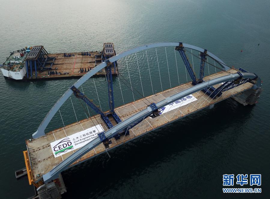 2月26日,從早晨7時開始,歷時5個小時,首次利用海潮漲落的“浮托法”,70多位現(xiàn)場施工人員經(jīng)過緊張調(diào)試,將內(nèi)地預(yù)制好的雙拱鋼橋精準(zhǔn)對接并安裝在橋墩上。