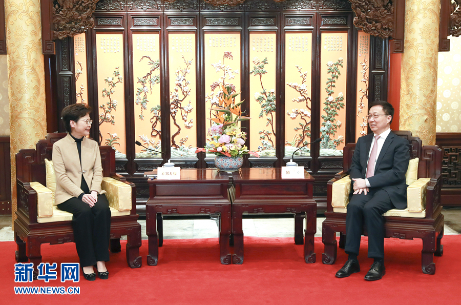 3月6日,中共中央政治局常委、國(guó)務(wù)院副總理韓正在北京釣魚臺(tái)國(guó)賓館會(huì)見香港特別行政區(qū)行政長(zhǎng)官林鄭月娥。新華社記者 龐興雷 攝