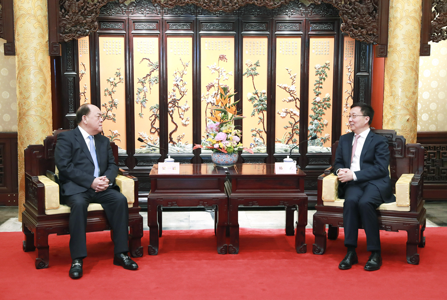 3月6日,中共中央政治局常委、國(guó)務(wù)院副總理韓正在北京釣魚臺(tái)國(guó)賓館會(huì)見澳門特別行政區(qū)行政長(zhǎng)官賀一誠(chéng)。新華社記者 龐興雷 攝