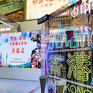 此次主題展展臺(tái)外觀通透明亮,內(nèi)部搭配錯(cuò)落有致的霓虹招牌,還呈現(xiàn)香港古跡和香港街道的場(chǎng)景,讓觀眾身在北京也能感受到香港豐富多元的都巿面貌,體驗(yàn)濃厚的“港風(fēng)”。展覽分為六大主題,包括“香港連接內(nèi)地與世界的橋梁功能”“商貿(mào)金融和創(chuàng)新科技”“多元文藝發(fā)展”“薈萃古今中外文化的特色”“綠色城市風(fēng)光”“京港合作交流”。展臺(tái)還設(shè)有兩個(gè)互動(dòng)裝置,以富有趣味的方式讓參觀者“連系”香港,并為香港送上祝福。