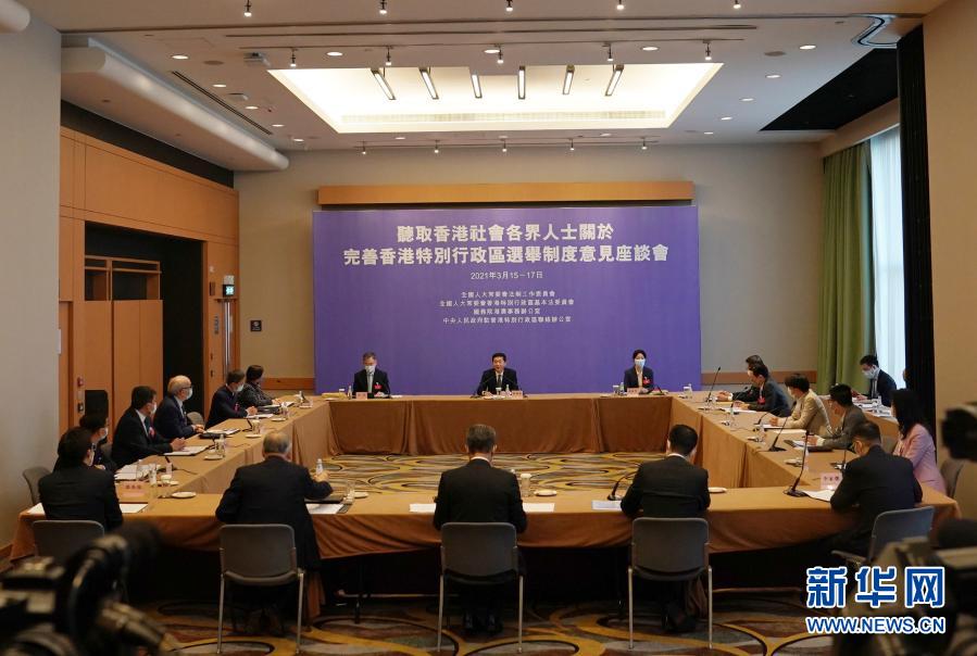 聽(tīng)取香港各界完善選舉制度意見(jiàn)座談會(huì)現(xiàn)場(chǎng)(3月15日攝)。新華社記者 李鋼 攝