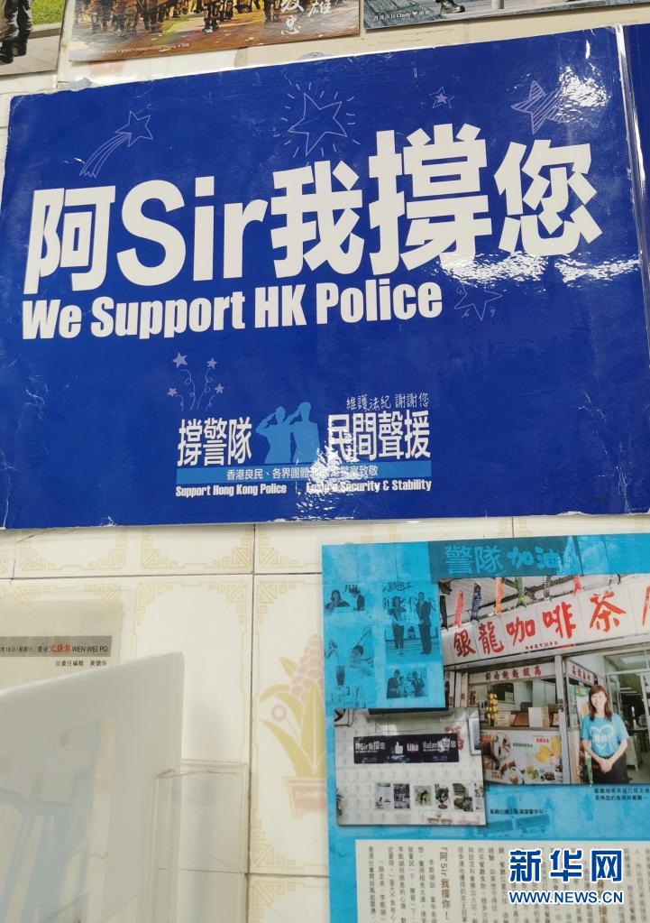 香港鯉魚門“銀龍咖啡茶座”餐廳內(nèi)張貼著許多撐警的海報,這張海報是2019年6月30日李凱瑚從萬人撐警大會上領(lǐng)回的(7月26日攝)。 新華社記者 陸敏 攝