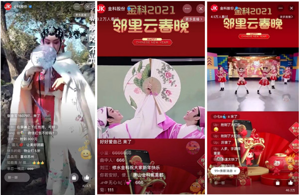 金科積極響應政府號召,也深度洞察人們對團圓的期盼,2月5日,集團品牌統(tǒng)籌舉辦了“金科2021鄰里云春晚”。通過一場鄰里春晚直播,打破了疫情防控常態(tài)化下的空間壁壘,讓全國百萬業(yè)主實現(xiàn)線上團圓。