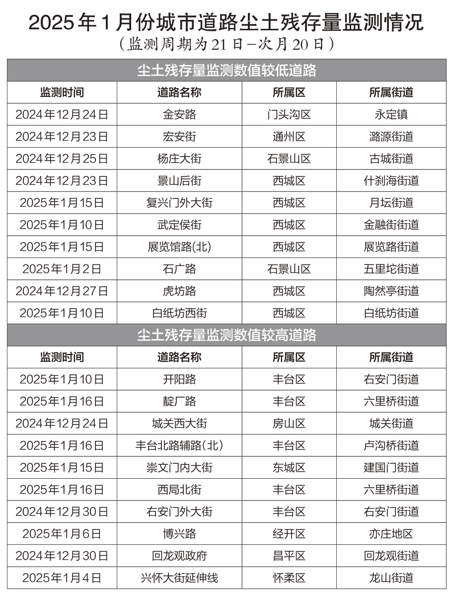 其中,各区一级道路均值为6.90克/平方米,二级道路均值为8.60克/平方米,环路(二三四环)均值为6.80克/平方米,跨区快速路(广渠路、阜石路等)均值为6.30克/平方米,城市道路尘土残存量在标准以内并稳中有降,道路扬尘得到有效控制。