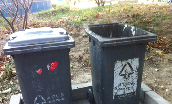 除了幾棵大樹之外,小區(qū)基本上沒有綠化,以前貌似種過綠草的地方,如今枯黃一片。垃圾桶早就已經(jīng)破舊不堪,在殘留的文字上,依稀可見當(dāng)時也曾嘗試過的垃圾分類。小區(qū)內(nèi)沒有兒童休息場所、也沒有健身器材,只是設(shè)有幾個孤零零的座椅。