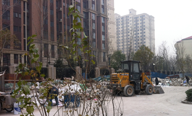 記者實地調查發(fā)現(xiàn),富力盛悅居項目北面有一個垃圾堆,主要是裝修之后的廢棄物和日常生活垃圾。因此離垃圾堆居住較近的居民比較擔憂夏季的到來,那時恐怕氣味會比較大。小區(qū)所有大門均設有門禁,但并未啟用,門口雖有保安,但并沒有阻止記者進入小區(qū)。小區(qū)內部環(huán)境與外面形成了強烈的對比,樹木茂盛,即使是冬季也顯得郁郁蔥蔥。有給兒童嬉戲的娛樂設施,有給成人設置的休閑場所,記者進入時物業(yè)工作人員正在給樹木修剪枝葉和澆水。雖然小區(qū)實施了人車分流,但很多業(yè)主的車并未停進地下停車場,而是隨意停在了小區(qū)外的道路兩端,將原本寬敞的四車道變成了如今狹窄的兩個車道。