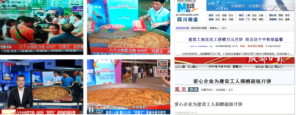 11:30許,在仁恒濱河灣建筑工地活動板房前,諾大的月餅已經(jīng)擺放在農(nóng)民工兄弟代表面前?!拔以缇吐犝f你們要來給我們送月餅,但是沒想到這個月餅居然這么大!”來自廣西的小姚不禁感嘆道。據(jù)記者了解,小姚雖然今年只有29歲,但是已經(jīng)做建筑工人快10年了。2011年帶女兒一起來到成都,足足已有三年沒有和家人一起過中秋節(jié)了。