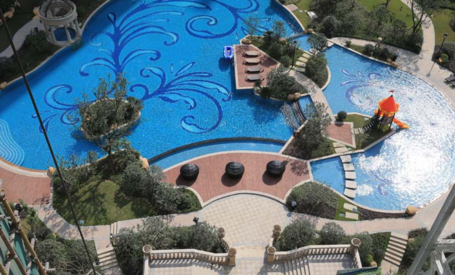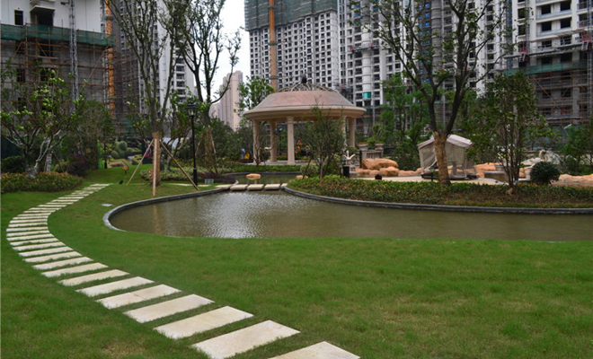 據(jù)資料顯示,大名城綠化率為41.5%,樓間距為160米,小區(qū)內(nèi)部區(qū)規(guī)劃擁有中央疊瀑和中央泳池。目前,大名城東區(qū)1400㎡無(wú)邊界游泳池已經(jīng)開放使用。記者實(shí)地走訪泳池周邊發(fā)現(xiàn),一名工作人員正在清理池內(nèi)雜物,該工作人員告訴記者,大名城工作人員會(huì)定時(shí)清理泳池及周邊景觀區(qū)域,保證小區(qū)內(nèi)部時(shí)刻干凈整潔??v觀東區(qū)整體景觀,池水清澈,周邊花卉植物、雕像噴泉錯(cuò)落有致,景觀整體格調(diào)高端。