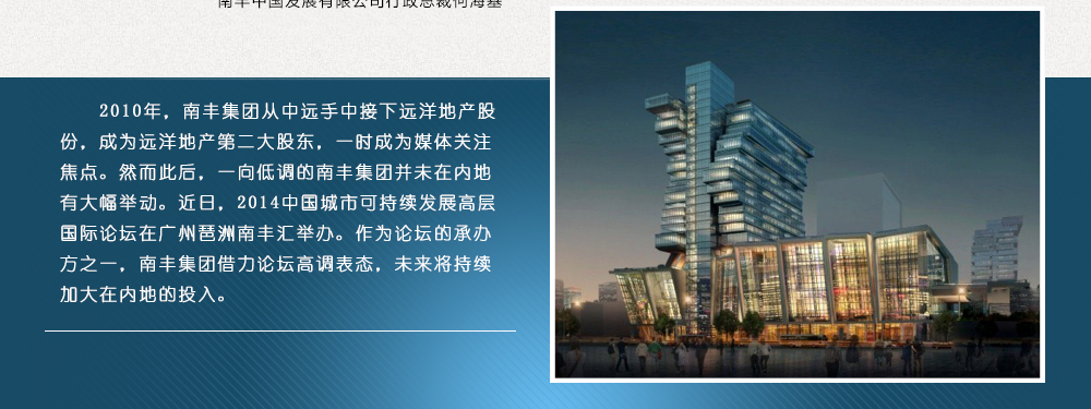 已在內(nèi)地三亞、北京、大連等地有多個(gè)項(xiàng)目的南豐中國(guó)是南豐集團(tuán)最接內(nèi)地“地氣”的公司,也更為熟悉內(nèi)地市場(chǎng)與政策。何海基認(rèn)為當(dāng)下中國(guó)城市可持續(xù)發(fā)展的趨勢(shì)使企業(yè)必須在做項(xiàng)目之前就考慮到幾年后買房及用辦公樓的人們對(duì)低碳、智慧等需求。【詳情】