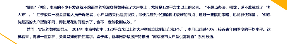 據(jù)黃媛分析,大戶型的熱銷主要原因有二。一是片區(qū)規(guī)劃的利好,周邊配套逐步成熟,吸引了主城區(qū)的客戶。而是其他片區(qū)單價(jià)昂貴,直接導(dǎo)致大戶型總價(jià)“離譜”,若想在南京改善居住品質(zhì),那么只有選擇還處于價(jià)格洼地的江北。黃媛認(rèn)為300萬(wàn)是個(gè)臨界點(diǎn),如果大戶型總價(jià)在300萬(wàn)以內(nèi),購(gòu)房者是可以接受的,但如果超過(guò)300萬(wàn),開(kāi)發(fā)商就會(huì)比較頭疼房子怎樣才能賣(mài)出去。
