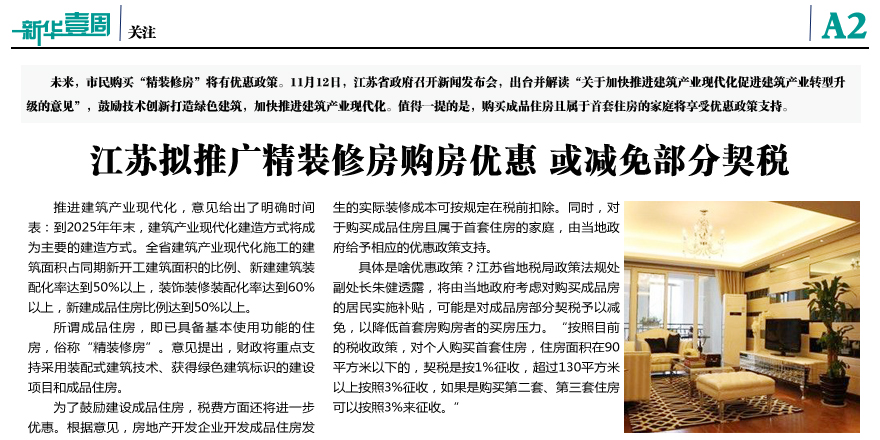 江蘇擬推廣精裝修房購房優(yōu)惠