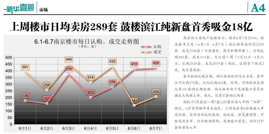 上周南京樓市日均賣房289套