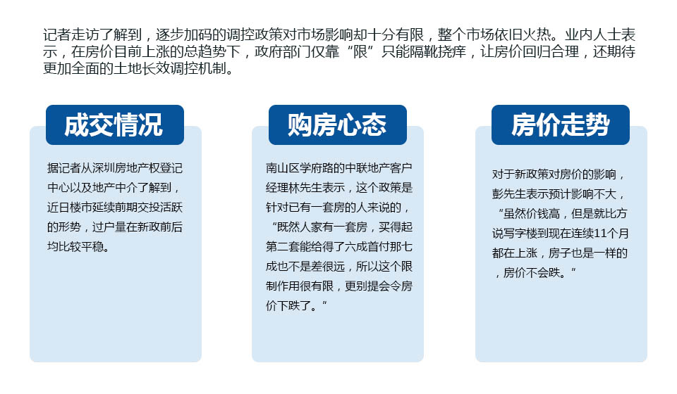 | 世聯(lián)地產(chǎn):將二套房貸首付比例調(diào)整至70%,不可避免的會(huì)對(duì)大家的心理造成一定的影響,但不足以改變房價(jià)上漲的預(yù)期。自從三季度以來,銀行由于房貸額度受限,部分銀行暫停房貸或上浮房貸利率,據(jù)媒體統(tǒng)計(jì),從10月中旬開始,深圳已有15家銀行上調(diào)房貸利率,其中首套房最高上浮20%,二套房最高上浮30%。因此此次提高首付比例短期內(nèi)對(duì)成交影響有限。[詳細(xì)] |