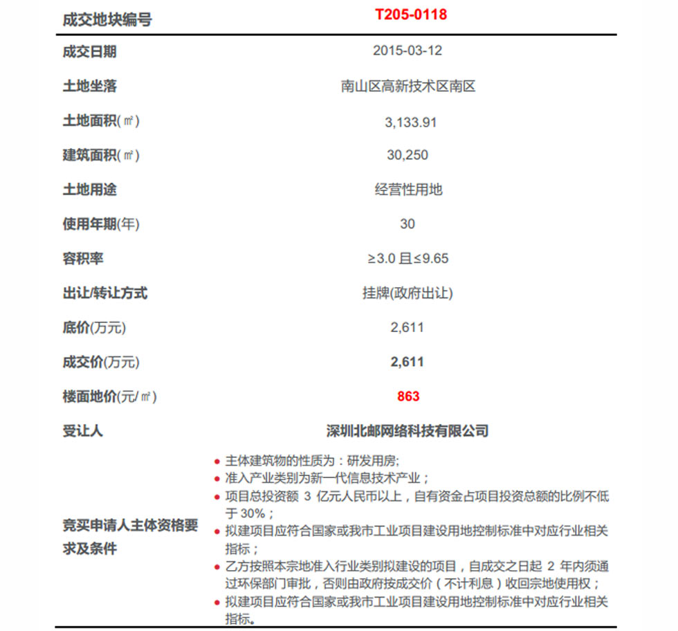 本周(3.9-3.15)成功出讓1宗經營性用地,由深圳北郵網絡科技有限公司以底價成交。