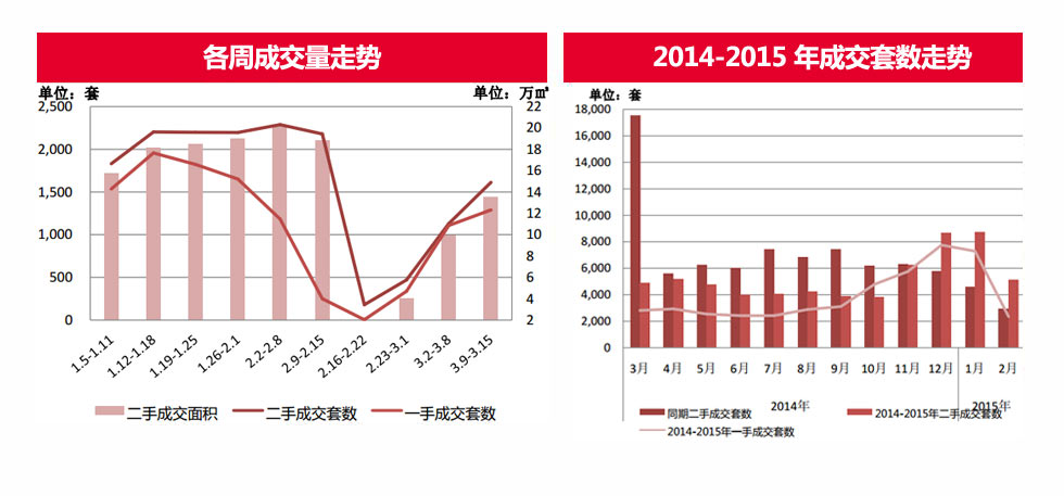 央行再次降息及兩會的支持促進房地產發(fā)展的基調, 均加速置業(yè)者入市的步伐,本周(3.9-3.15)二手樓成交1613套,環(huán)比上漲42.73%,成交面積13.49萬平方米,環(huán)比上漲36.47%。