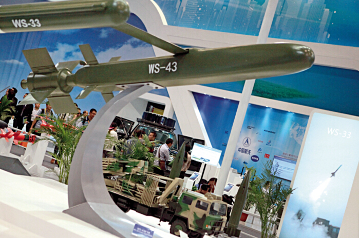 ????Cruise Missile: The “Defender-43”?cruise missile, made by China Aerospace Science and Technology Corporation, is launched by a heavy-caliber rocket system with a range of 10 to 60 kilometers. It can cruise for more than 30 minutes above the target and strike time-critical, maneuvering and rear-slope targets. This warhead has a two-way data chain that transmits pictures to help locate the target, assess the strike and guide other firepower.