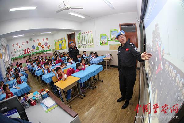 維和警察亓恒剛為青島市樺川路小學的師生們講述在利比里亞的執(zhí)勤任務(wù)。