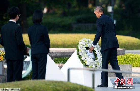 ????資料圖:2016年5月27日,美國總統(tǒng)奧巴馬乘直升機(jī)抵達(dá)日本廣島和平紀(jì)念公園附近,展開對和平紀(jì)念公園的訪問并獻(xiàn)上花環(huán)。