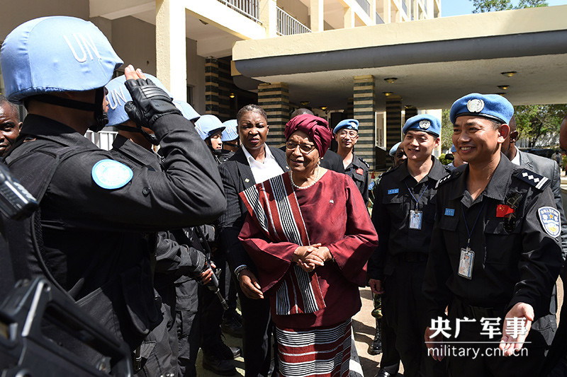 圖為利比里亞總統(tǒng)瑟利夫看望慰問(wèn)防暴隊(duì)隊(duì)員。(資料圖)