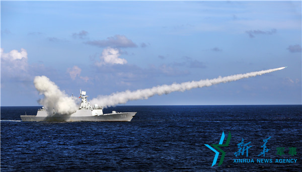 ??? 海軍在海南島至西沙附近??沼蚪M織實(shí)兵實(shí)彈對(duì)抗演練,這是導(dǎo)彈護(hù)衛(wèi)艦運(yùn)城艦發(fā)射反艦導(dǎo)彈(7月8日攝)。新華社記者查春明攝