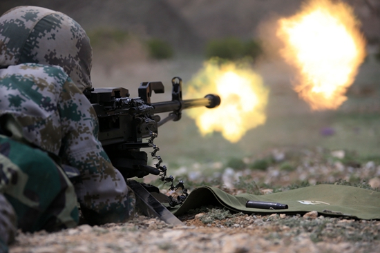 2016年4月25日,西部戰(zhàn)區(qū)陸軍某團(tuán)機(jī)槍連官兵攜帶重機(jī)槍對“敵”目標(biāo)實(shí)施火力打擊。視覺中國供圖(資料圖片)