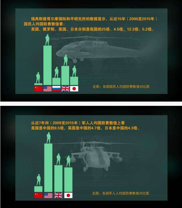 【中國人均國防費(fèi)為690元人民幣,約104美元】相當(dāng)于美國的1/18、日本的1/4、英國的1/9、法國的1/7、俄羅斯的1/5