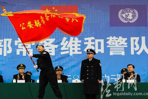圖為公安部部長助理王儉為常備維和掛牌成立授旗