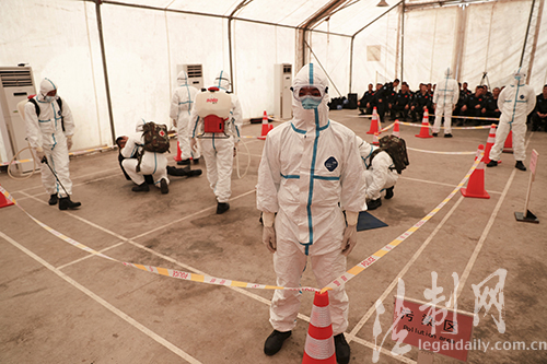 圖為維和警察防暴隊(duì)開展綜合防疫衛(wèi)勤科目演練