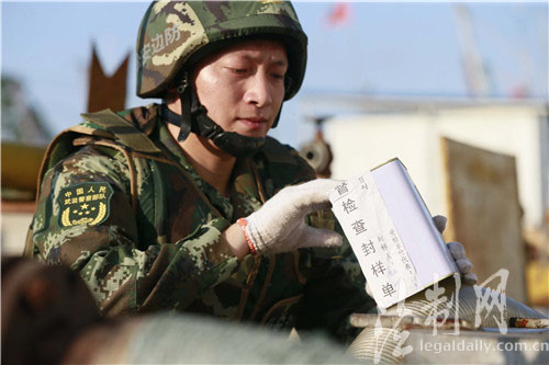 圖為邊防官兵對(duì)成品油進(jìn)行抽樣送檢