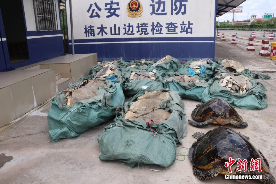 ????6月27日,廣西防城港邊防支隊楠木山邊境檢查站執(zhí)勤官兵在對一輛重型廂式貨車例行檢查時,查獲涉嫌非法運輸玳瑁標本2只、鯊魚皮11袋。這兩只玳瑁標本重量共達到40多公斤,而11袋鯊魚皮重約1噸。據(jù)悉,玳瑁是國家二級重點保護野生動物,已被列入《世界自然保護聯(lián)盟》(IUCN)2012年瀕危物種紅色名錄。(張振國)