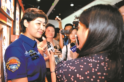 中國人民解放軍航天員大隊(duì)航天員劉洋在展覽現(xiàn)場接受媒體記者的采訪。本報(bào)記者 宋雯 攝