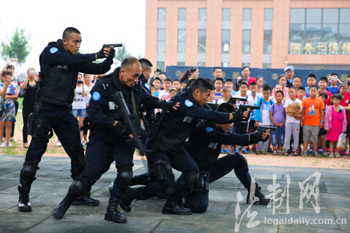 圖為特戰(zhàn)隊(duì)員為小學(xué)生們進(jìn)行“維和礪劍”科目表演