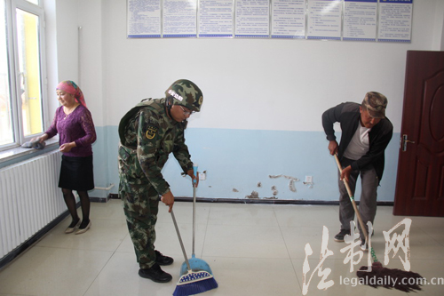 圖為“親戚”們在主動為官兵打掃警務室衛(wèi)生
