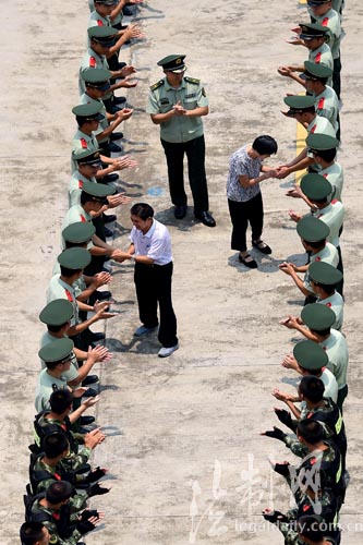 圖為官兵們夾道歡迎梅開春父母來隊(duì)