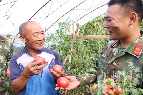 圖為當地農民稱贊官兵自己種植的西紅柿